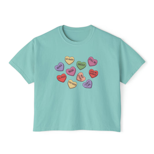 Funny Anti Valentine's Day Candy Hearts Boxy Cropped Tee, Funny Valentine's Cropped T-Shirt, Trendy Women's T-shirt